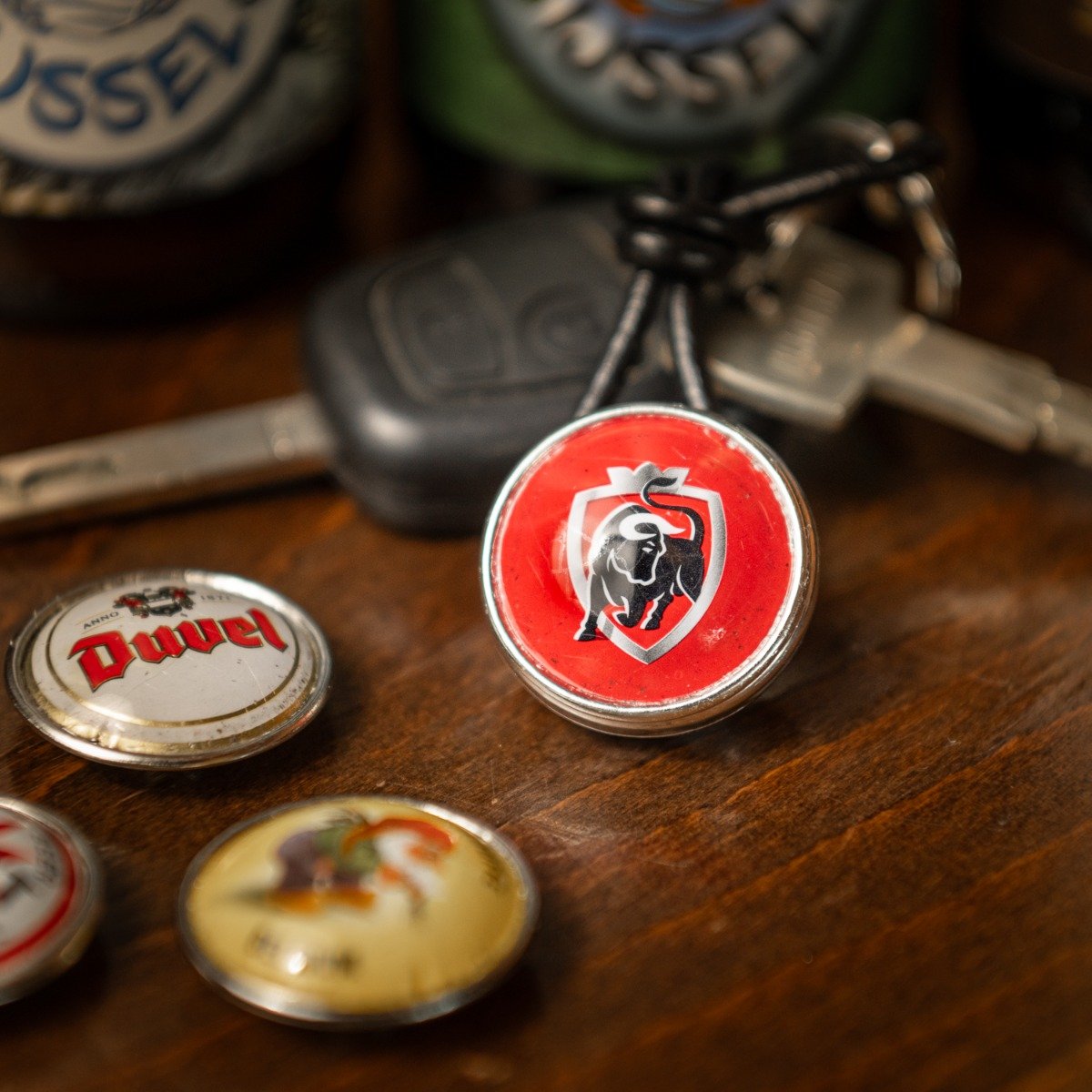 De Duvel-kroonkurk, met zijn herkenbare logo en iconische uitstraling, voegt een vleugje authenticiteit toe aan je sleutelbos. De drukknoppen zijn afgewerkt met een waterdichte lak, waardoor je sleutelhanger er niet alleen stijlvol uitziet, maar ook bestand is tegen dagelijkse slijtage.