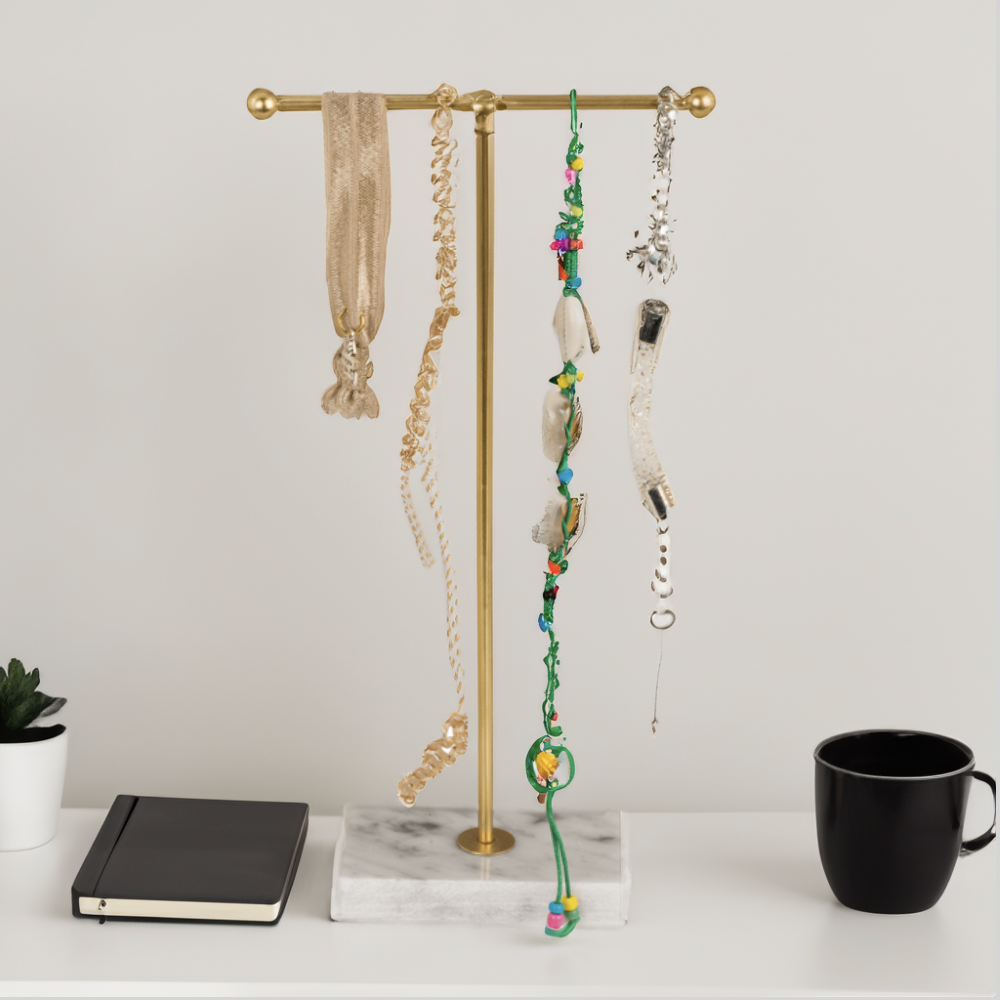 Dit sieradenrek is een waar meesterwerk in goudkleurig metaal, met een prachtige marmeren basis die een vleugje luxe toevoegt aan je sieradencollectie. Het is als een miniatuur kunstwerk dat je sieraden tot leven brengt.