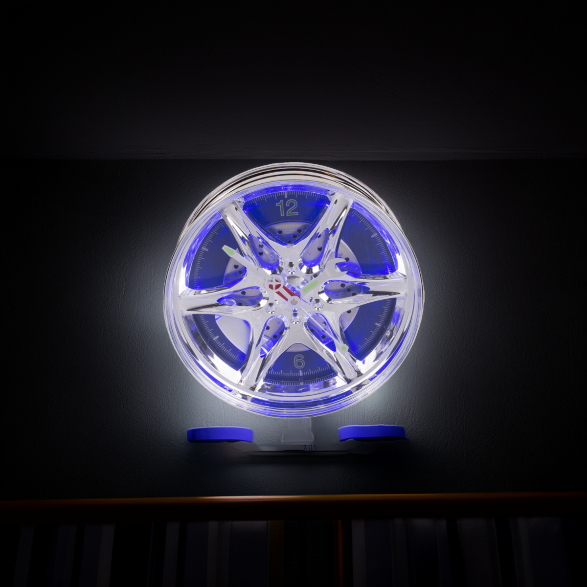 De wiel wandklok is niet zomaar een klok, maar een echte eyecatcher voor je interieur. Met zijn unieke design in de vorm van een autovelg en blauwe LED-verlichting trekt hij direct de aandacht. Deze klok is perfect voor liefhebbers van auto's en moderne woonaccessoires. Hang hem in de woonkamer, garage of zelfs in je kantoor en geef de ruimte een stoere, eigentijdse uitstraling. Het cadeau-idee voor iedereen die houdt van een combinatie van stijl en functionaliteit.
